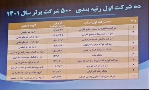 در این رتبهبندی که از سال 1377 توسط سازمان مدیریت صنعتی کشور برگزار میگردد، شرکتهای برتر از نظر رشد سریع، صادرات گرا بودن، دارای رتبههای ویژه و .. معرفی می گردند. همچنین در این ارزیابی شاخصهایی همچون بیشترین فروش، بیشترین سودآوری، بالاترین ارزش بازار، بالاترین اشتغالزایی و… معرفی میشوند.